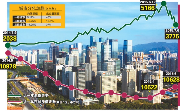 在股市跌宕起伏、猶如坐過山車的6月,樓市交投熱度卻一路走高,更勝「紅5月」。方華創證券統計數據顯示,截至7月3日,上周30大中城市商品房日均成交面積87.0萬平方米,環比上漲25.7%,同比上漲98.2%。從不同區域看,一線城市成交環比大漲46.4%,二線城市成交環比上漲17.6%,三線城市成交環比上漲25.7%,一二三線城市日均成交量均創年內新高。方華創證券認為,房地產成交量環比大幅上漲主要是受上周末央行降息和定向降準的雙重利好刺激。目前房地產整體回暖明顯,一線城市已連續數月「量價齊漲」。除了政策上的利好刺激,也有分析稱近期因為A股回調,股市見頂的跡象越發明顯,大批資金撤出股市對樓市或也起到了一定的刺激作用。股市和樓市,似乎暗地里有一種敵對的關系,去年樓市蕭條時,到處都是賣房炒股的呼聲,今年樓市漸漸火了起來,大家又開始熱議是不是要「賣股炒房」。分析認為,股市與房市雖未必存在固定的正向或反向聯繫,但本輪牛市前期的大漲帶來獲利回吐的需求是不可忽視的,兩個市場之間存在一種類似資金「蹺蹺板」的關系。2010年到2014年的A股「慢熊」里,房產價格走出了一波「波瀾壯闊」的升勢。根據中原地產的數據顯示,2010年1月至2014年2月期間,中原二手住宅價格指數上漲了41%,而同期上證指數下跌了38.5%。