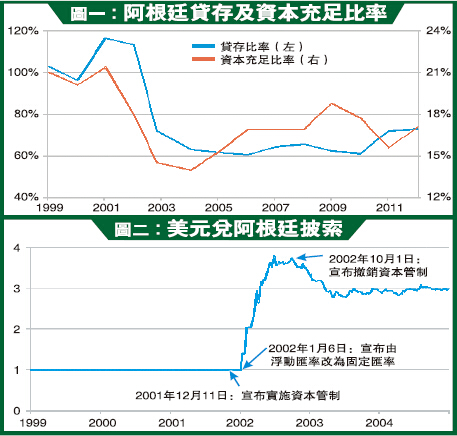 2002年阿根廷金融風暴是近年較著名的銀行危機。根據央行數據,1999年12月阿國銀行體系總存款為815億披索,而貸款總額卻高達839億披索,一元成本竟做超過1元生意!貸存比率不合理地高(見圖),反映過往多年國內銀行為求高利潤而過度放貸,部分銀行不良貸款比率更高達30%,顯示貸款過度之餘,更無視借款人質素,最後陷入萬劫不復之地,這亦是希臘銀行現時面對的一大問題。
