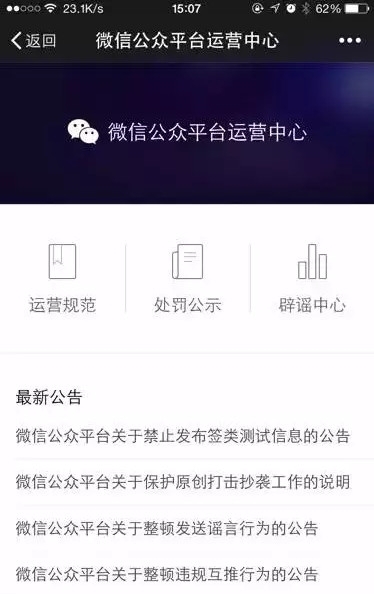 在處罰公示方面,微信方面將定期公示部分被處罰的賬號,讓運營者更清楚平台所重點整治的違規行為有哪些,並自覺遵守平台規則;在辟謠中心方面,手機版公眾平台展示了近期熱門謠言以及科普結論。