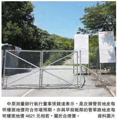 中原測量師行執行董事張競達表示,是次掃管笏地皮每尺樓面地價符合市場預期,亦與早前毗鄰的管翠路地皮每尺樓面地價4621元相若,屬於合理價。他指,近期發展商投地態度積極,多幅地皮入標反應熱烈,是次地皮日前截標反應亦踴躍,共收到10份標書,最終由中資財團獨資投得,可見發展商對后市樂觀,估計內地實力房地產發展商來港投地趨勢會繼續。張氏指,計及建築成本及利潤等,預計項目日后實用面積售價每平方尺約1.2萬元。