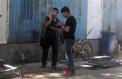 6月20日,平安里育德胡同,男子(左)正給家里打電話讓匯錢,“醫托”守在其旁邊。