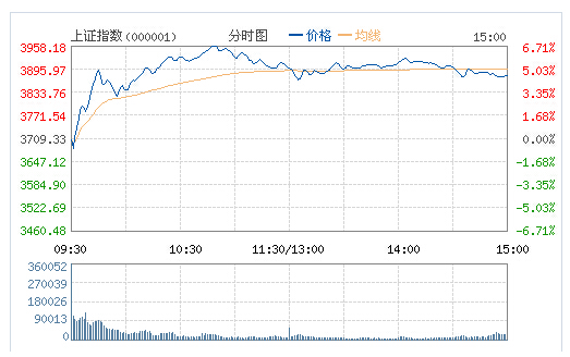 截至收盤,滬指漲4.54%報3877.80點,成交6804億元;深成指漲4.59%報12038.14點,成交2473億元。