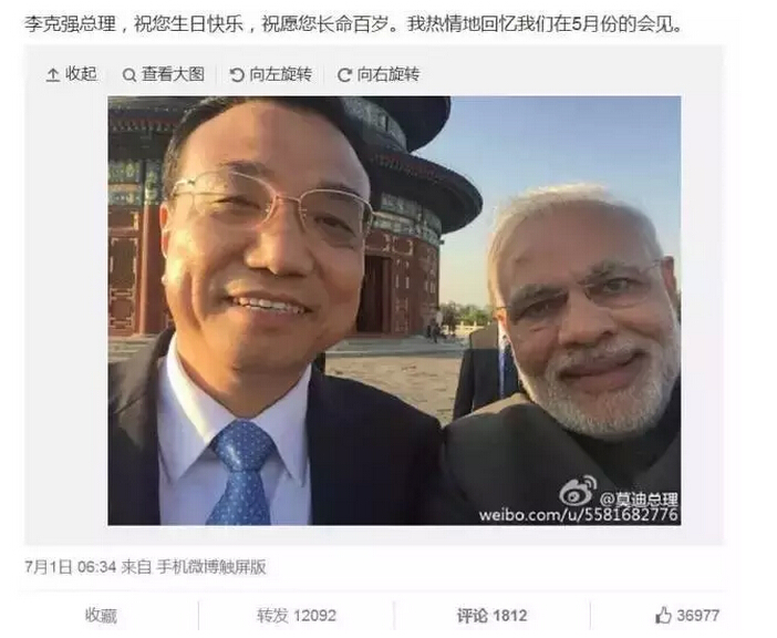 2015年7月1日早上,一條特別的生日祝福在新浪微博上引發熱議。這條微博出自印度總理莫迪的新浪微博賬號@莫迪總理,還配上了2015年5月莫迪訪華時與李克強的自拍照。