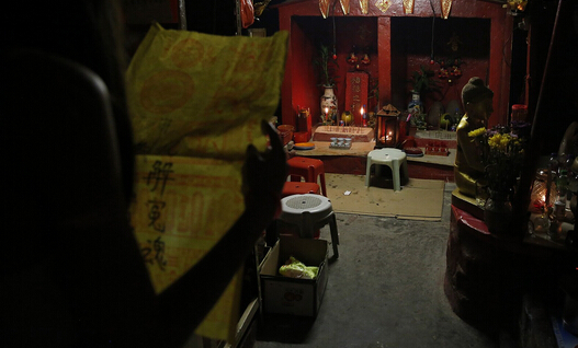 圖為2014年8月17日,一位香港女子準備燒掉一張寫有“冤死鬼”的護身符。