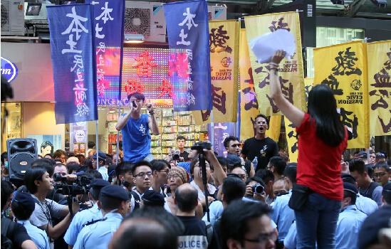 “愛港行動”召集人陳凈心昨午四時聯同近二十名成員,在旺角西洋菜南街的行人專用區舉行論壇,“本土民主前線”發言人黃臺仰帶同近十多名成員與“熱血公民”約十多名成員前來滋擾,警方即時架起鐵馬分隔雙方人士。“港獨”成員數度嘗試沖破警方防線,沖擊“愛港行動”街站,警方舉起紅旗警告和制止。約下午六時,“愛港行動”離開現場,惟“港獨”人士尾隨其后,被警方多次攔截,搞事者不滿警方安排,與警方發生碰撞,有人更沖出馬路,堵塞山東街及彌敦道一帶交通,沿途不少商舖被迫落閘。