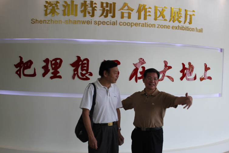 在合作區的采訪過程中,有小個插曲:在展示廳的大沙盤前,葉征航正在給采訪團介紹情況,一位熟悉的身影出現在大家面前,本報原社長、前深圳報業集團社長吳松營帶著另一位老先生,精神矍鑠的從香港趕到汕尾,說要為合作區的發展貢獻余力。記者們被這位值得尊敬的老報人吸引,紛紛上前問候。雖然退休多年,但提起深汕合作區,老先生就抑制不住興奮,“有深圳改革的成功經驗,有包括深圳在內的粵港企業的資金,再加上合作區獨特的地理位置優勢,這里會建得和深圳一樣好。”老社長雖已是年過七旬的老者,但仍然心系開發區的發展,專程從香港請來城市規劃專家朱杰教授,為開發區的建議出謀劃策。