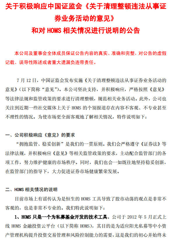 恒生電子早間公告:HOMS被稱作引發股市震蕩主力的說法是不客觀