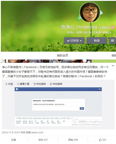 2014年占中期間,陳凈心就在微博上透露自己的Facebook帳號被封