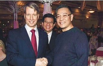 1月18日,程慕阳(右)在温哥华自由党筹款活动时,与自由党议员候选人握手。资料图
