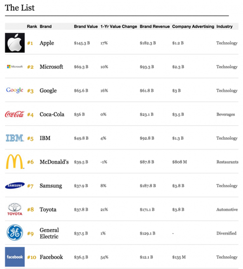 科技行業擁有非常強勁的力量,在福布斯最新評選出來的全球最具價值品牌中,蘋果、微軟、IBM、谷歌、英特爾、三星、思科、SAP、甲骨文、AT&T、Verizon等大型科技公司在前25名中占了主要地位,這些來自科技領域的公司總共貢獻了4364億美元的價值,剩下的則是一些來自食品、零售及汽車領域的公司,它們貢獻的總價值為3755億美元。