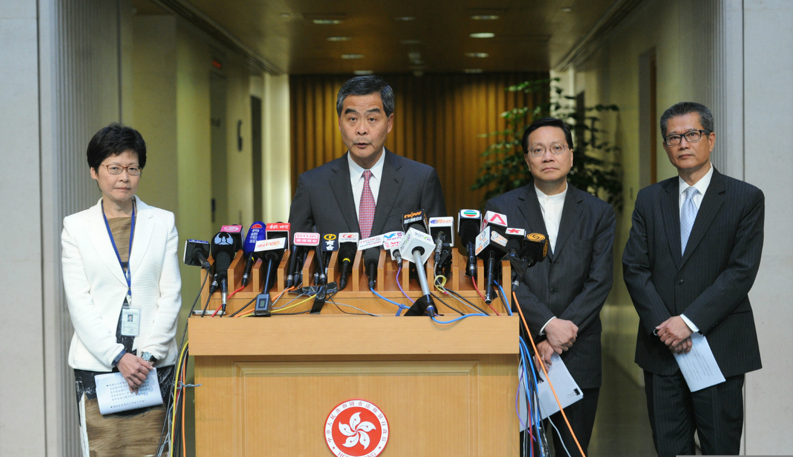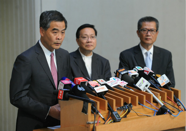 7月17日,行政长官梁振英(左二)宣布成立调查委员会,进行独立而全面的调查。