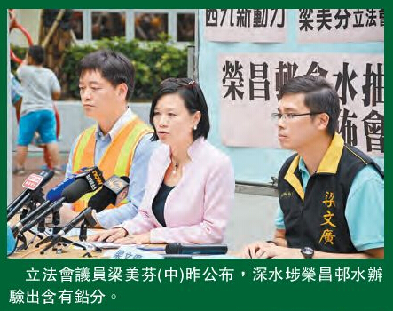 西九新動力早前在深水桋榮昌邨兩幢樓宇,包括榮杰樓和榮俊樓各取4個水樣本化驗,發現榮杰樓有樣本含鉛量超標,每公升含18微克鉛,比世衛的標準10微克為高。梁美芬表示,有關樣本在榮杰樓低層單位的廚房水龍頭抽取,抽取方法為先開水喉,待水流一兩分鐘后才用化驗所提供的容器抽取樣本。梁美芬說,抽取水辦的住戶中包括一位懷孕婦女,要求政府為榮昌邨驗水、檢驗水龍頭物料,并盡快開街喉和派樽裝水。對於政府就食水含鉛超標成立調查委員會,她表示歡迎。問到立法會是否需要引用特權法跟進事件,就要視乎政府委任委員會成員,公眾會否接納。