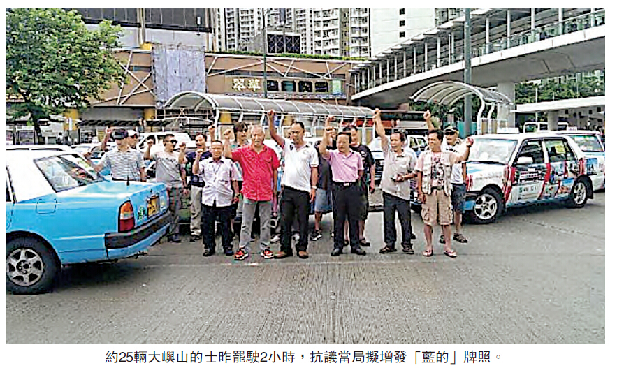 另外,昨日中午12時,約25輛大嶼山的士在東涌港鐵站罷駛2小時,抗議政府計劃增發25個大嶼山的士牌,令大嶼山的士牌數目增至75個,擔心影響生計。大嶼山的士聯會指,若果政府拒絕減少新牌數目,不排除採取下一步行動,例如慢駛抗議。聯會要求政府先發10個新牌再作檢討。運輸署回應指,會繼續與的士業界溝通。