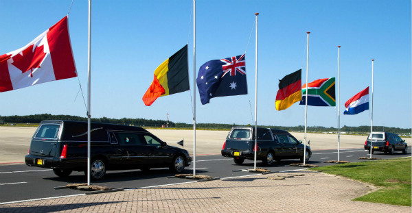 2014年7月23日,在荷兰艾恩德霍芬,运送马航失事客机40名荷兰乘客遗体的车队驶过路边的各国国旗。