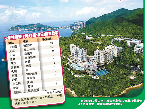 【香港商報網訊】記者鄭達偉報道:隨著股市陰霾漸散,樓市交投亦隨之活躍起來。綜合一手銷售網及市場消息,截至昨晚8時,過去周末兩日共錄得36宗成交,按周上升約57%,當中豪宅表現優於中小型單位,并隨大手成交個案頻現,率先揭開下半年豪宅盤追落后的序幕。