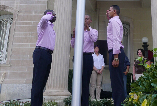 美国与古巴将于7月20日互设大使馆7月19日,在美国华盛顿,几名男子在古巴驻美国利益代表处前进行升旗仪式排练。