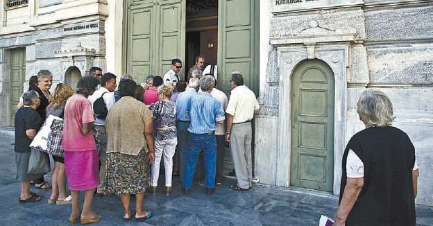 在停業三周后,希臘各銀行昨天恢復營業,但資本管制繼續維持,客戶能夠辦理的業務仍有諸多限制。圖為銀行外大排場龍。
