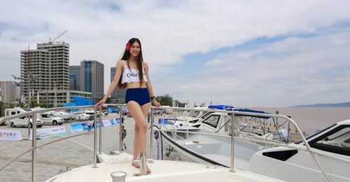 7月19日,2015中国(舟山群岛)国际游艇展在浙江舟山举行。在1.5万平米的展区内,60余艘国内外知名品牌游艇纷纷亮相,身着比基尼的“船模”美女也清凉助阵。迎着习习海风,展会形成了游艇、尚品及休闲产业相结合的产业链集聚区,也在人群的簇拥中映照出独特的滨海休闲生活。中新社发 余若望 摄
