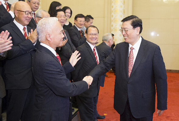 张德江与中華總商會訪京團代表握手。