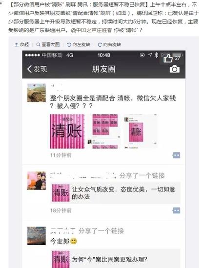 新浪科技訊 7月22日上午消息,今天上午許多網友表示自己所發的微信朋友圈圖片被強制替換成“請配合清賬”的圖片內容。對此,騰訊方面回應稱,是由於少部分服務器上午升級導致短暫不穩定。