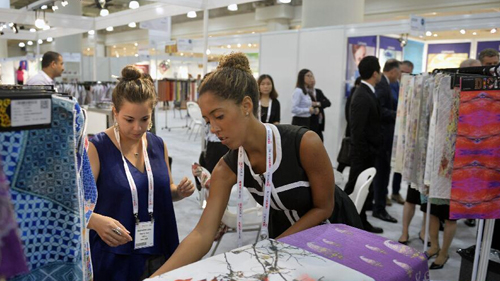 7月21日,在美国纽约,观众在中国纺织品服装贸易展览会上了解中国产品。当日,第16届中国纺织品服装贸易展览会在纽约开幕,600余家中国纺织企业参展,展出各种服装服饰、服装面料以及家用纺织品。纽约中国纺织品服装贸易展览会由中国国际贸易促进会纺织行业分会与法兰克福展览(美国)公司共同承办,为中外企业搭建平台、拓展国际市场,促进中国和国际服装和纺织业的沟通与发展。新华社记者王雷摄