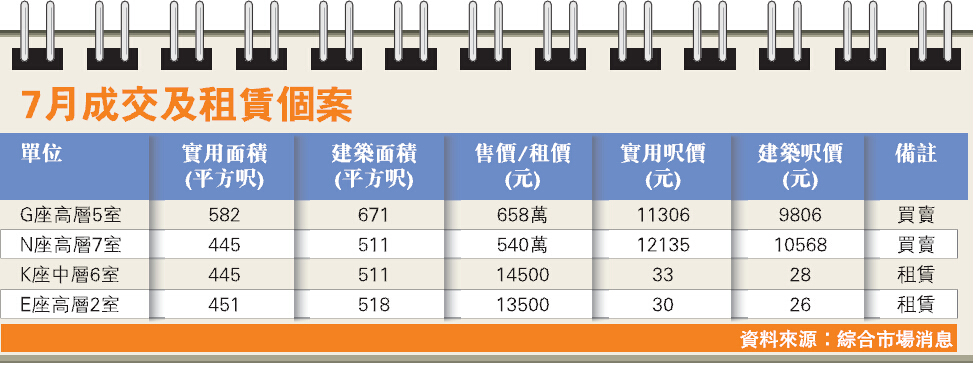 中原地產分區經理林經略表示,現時屋苑約有50個放盤,當中約30伙兩房單位,其餘屬三房戶型,而目前屋苑500萬元內的單位寥寥可數。他續指,由於本月初港股走勢波動,導致買家購樓態度轉趨謹慎,加上業主叫價態度企硬,令屋苑交投亦一度冷清,綜合市場消息指,屋苑7月截至15日止,僅錄得兩宗買賣成交個案。有關單位分別位於N座高層7室及G座高層5室,前者實用面積445平方呎,以540萬元售出,實用呎價12135元,後者實用面積582平方呎,以658萬元易手,實用呎價11306元。