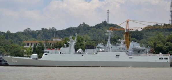 “宿迁舰”是我国自行研制生产的新一代轻型护卫舰,舷号504,舰长89米,宽11米,满载排水量1300余吨,舰上武器装备信息化程度高、隐身性能好,具有较强的防空、反潜和对海作战能力,可单独或协同其他兵力,攻击水面舰艇和水下舰艇。