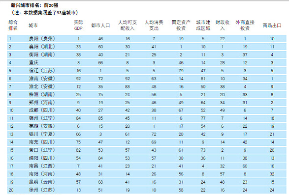 按此標準,貴陽是新興城市榜首。