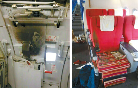 在公布的現場圖中顯示,深航客機紅色的座椅,以及機艙艙門位置,均有不同程度的損壞,有明顯的火燎烟燻痕跡,這似乎印證了網友所說該名旅客確實攜帶有易燃物品。