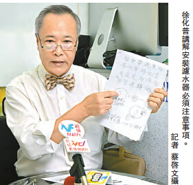 徐化普表示,《水務設施規例》第24條規定,安裝的濾水器不得直接與公用供水系統接駁,以免供水系統內的食水受污染,故市民安裝濾水器時應安裝氣鼓和泵等裝置,令濾水器隔出來的污染物不會因壓力回流至公用的供水系統中,影響其他住戶。