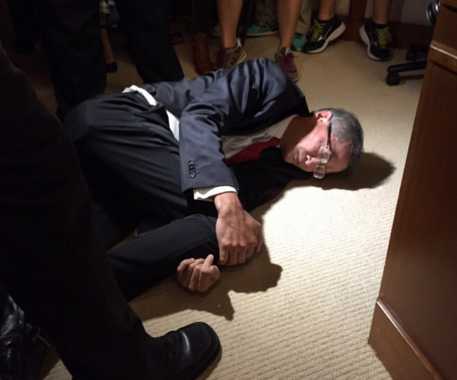 校委員成員盧寵茂在学生冲击中倒地不起。
