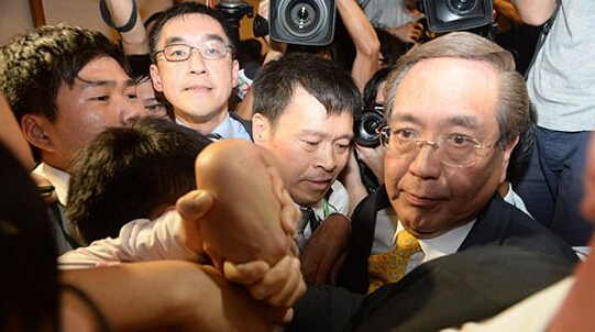 李国章(右)斥冲击校委会会议的学生。