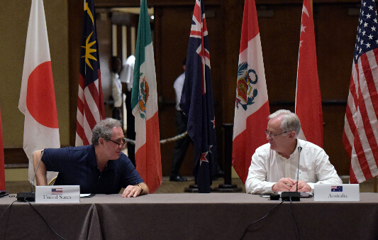 (国际)(1)新一轮TPP部长级会议在夏威夷开幕7月28日,在美国夏威夷毛伊岛,美国贸易代表迈克尔·弗罗曼(左)和澳大利亚贸易与投资部部长安德鲁·罗布出席TPP会议。