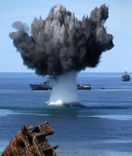 图为日本海上自卫队6月24日在硫黄岛海域使用实物进行了海上扫雷训练。