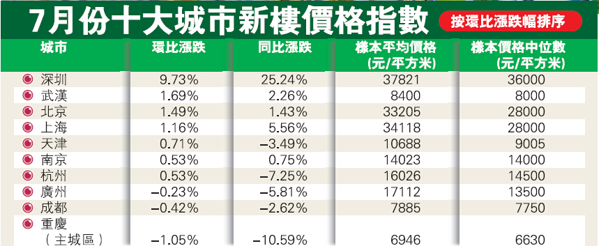 此外,二手房市場也迎來一輪強勁回暖,包括北京、上海、武漢、南京等十大城市7月份主城區二手房價全部進入上漲通道。領漲的深圳市二手房價環比漲8.11%,同比漲29.40%。