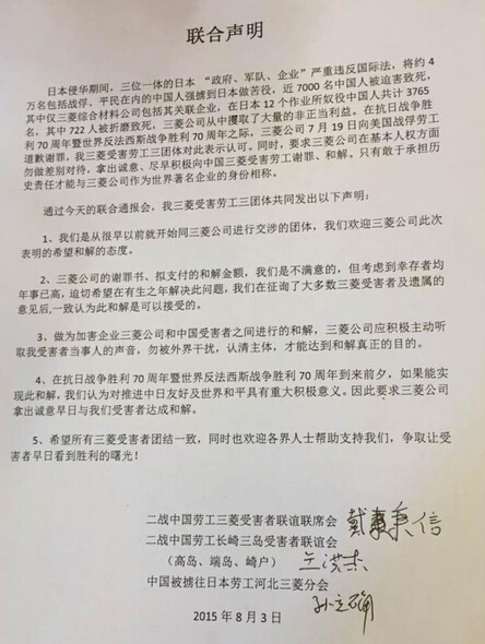 声明还认为,如果能实现此和解,对推进中日友好及世界和平具有重大积极意义,因此要求三菱公司拿出诚意早日与受害者达成和解。