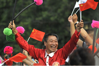 7月31日,在北京市延慶縣望京廣場,當地居民慶祝北京攜手張家口獲得2022年冬奧會舉辦權。 新華社記者 高健鈞/攝