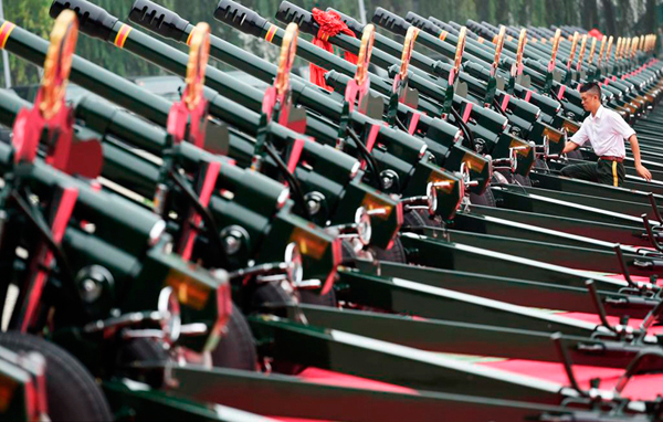 2015年8月1日,北京,由山西北方機械制造有限責任公司制造的數十門禮炮亮相某演練場。隨著紀念中國人民抗日戰爭暨世界反法西斯戰爭勝利70周年閱兵式臨近,被譽為共和國禮炮部隊的武警某部進入積極備戰狀態。來源:人民網 作者:胡遠嘉