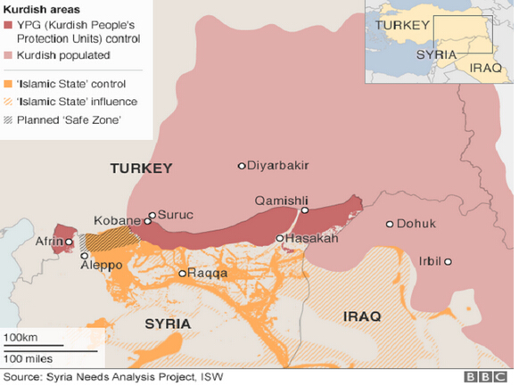 在美國的支持下,YPG在敘利亞北部的勢力不斷擴張,與PKK關系密切的YPG因此對土耳其構成威脅。在美國配合下,YPG將ISIS武裝分子驅趕出敘利亞北部部分地區,然后將這些地區納入自己的控制之下,這讓土耳其政府非常不快。