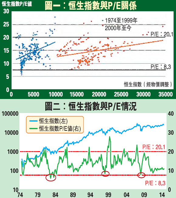 自從經過2007年大牛市后,大家都有個「心魔」:高股價等於高P/E,即P/E應隨股價強弱而上落。理論上確應如此,但事實又如何?圖一見到,1974年初至今(使用恒指服務公司提供由1973年起的P/E數據),恒指(經物價調整)與P/E關系算是同向,2000年前兩者的相關系數為0.34。隨著時間演變,當恒指愈升愈高時,恒指與P/E的同向關系稍為有點弱化,2000年后至今恒指與其P/E關系約0.30,但大體上仍算是同向。