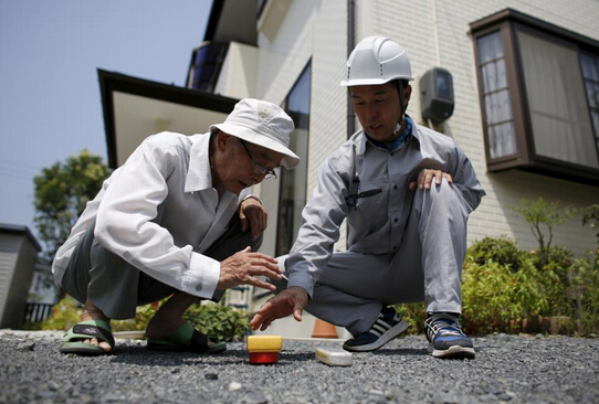 木幡义辉(左)在用盖格计数器检测位于福岛的家的辐射等级