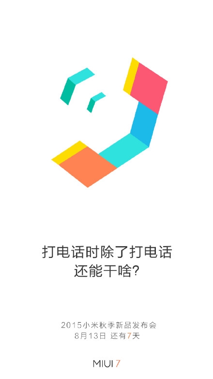 鳳凰數碼訊 8月6日消息,據快科技報道,這兩天,小米一直在官方微博上為發布會宣傳造勢,今天的一張海報頗有意思。小米稱,MIUI 7發布會還有7天,強大的黑科技:猜猜看,打電話時除了打電話,還能干啥?