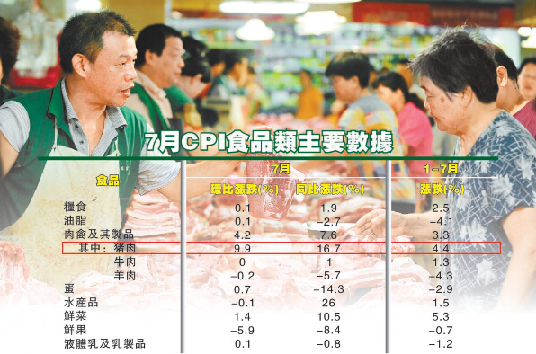 數據顯示,7月份豬肉價格同比上漲16.7%,比上月擴大9.7個百分點,對CPI總指數的影響從上個月的0.20個百分點擴大到0.48個百分點。