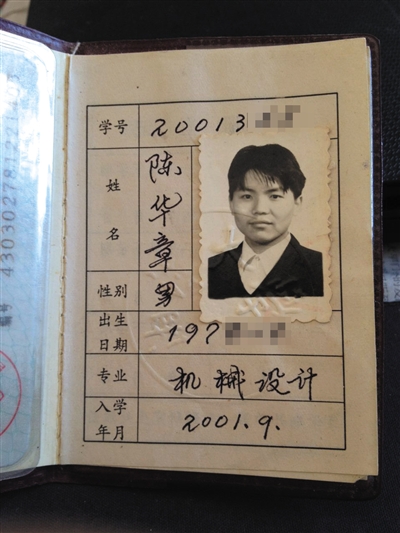 攝十幾年前,學生證里的陳華章面容清秀。父親陳克忠在想他的時候會拿出來看看。新京報記者 羅婷 攝
