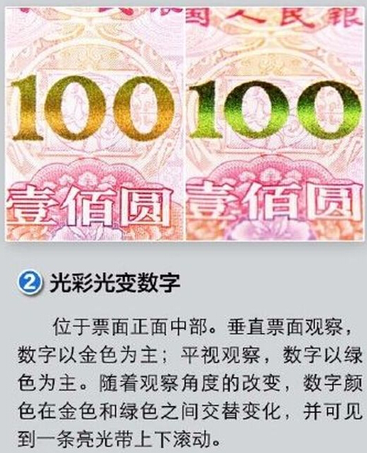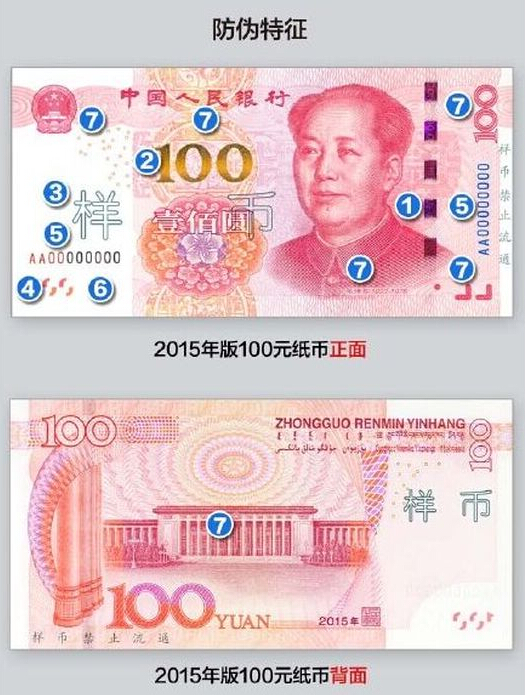 公告顯示,2015年版第五套人民幣100元紙幣在保持2005年版第五套人民幣100元紙幣規格、正背面主圖案、主色調、“中國人民銀行”行名、國徽、盲文和漢語拼音行名、民族文字等不變的前提下,對部分圖案做了適當調整,對整體防偽性能進行了提升。