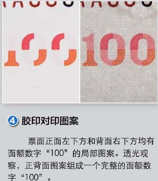 四、正面左下方的膠印對印圖案,正面透光視可見完整數字「100」。