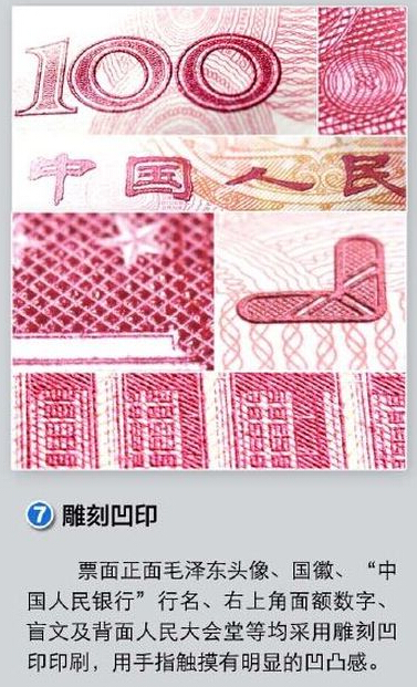 七、背面人民大會堂,毛澤東頭像等均採用雕刻凹印。