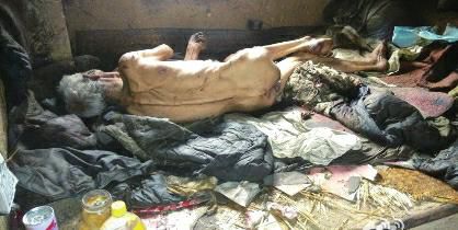 網友發布的多張照片顯示,一位老年男子全身赤裸蜷縮在一堆破舊的棉布上,其頭發花白,瘦得皮包骨。