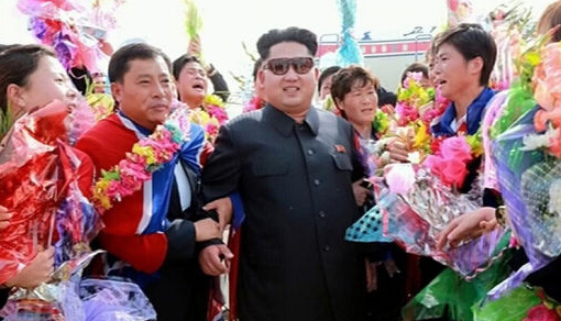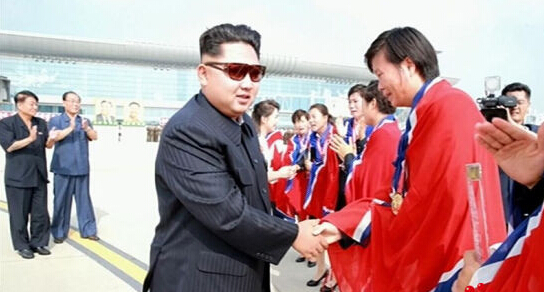 2015年8月10日消息,據朝鮮中央電視臺報道,朝鮮最高領導人金正恩親自前往平壤順安國際機場迎接在東亞杯女足比賽中奪冠的朝鮮女足代表隊凱旋。圖片來源:CFP