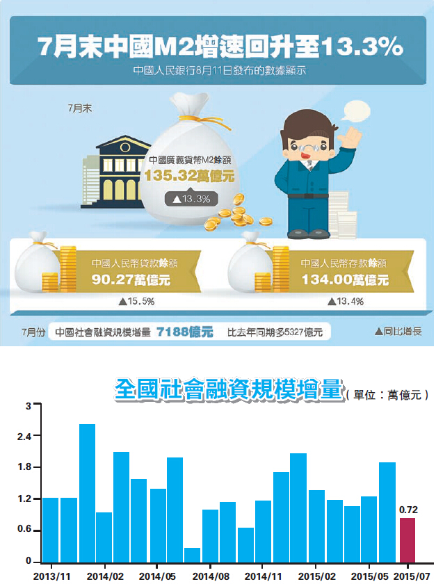 為了穩定股市,7月份對非銀金融機構的貸款快速膨脹至人民幣8864億元。即便剔除這部分貸款,7月份M2同比增速仍從6月的11.8%上升至12.7%,季節調整后月環比年化增速和季環比年化增速分別上升至21.8%和15.7%。